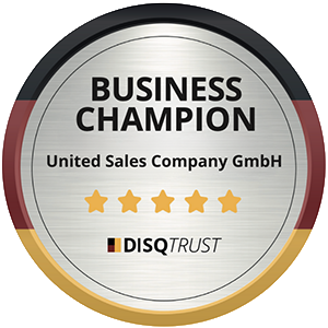Die United Sales Company wurde mit dem „Business Champion“-Siegel ausgezeichnet und zählt damit zu den Unternehmen, die im Bereich moderner Unternehmensführung besonders überzeugen. Das Siegel wird vergeben von DISQTrust, einer Marke des Deutschen Instituts für Service-Qualität (DISQ). Das Institut steht seit nahezu 20 Jahren für unabhängige Analysen, die die Leistungsfähigkeit deutscher Unternehmen transparent und vergleichbar machen.