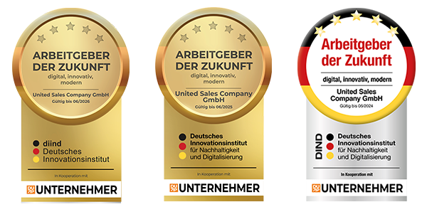 Zum 2.Mal in Folge erhielt die United Sales Company GmbH die Auszeichnungen zum „Arbeitgeber der Zukunft“ und zum Unternehmen mit einem „TOP Service“ des Deutschen Innovationsinstituts für Nachhaltigkeit und Digitalisierung.