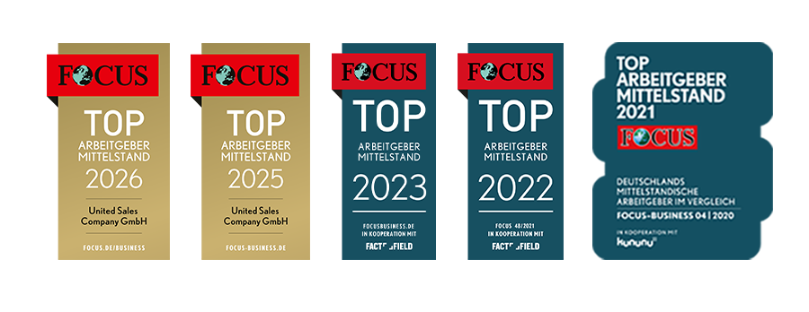 Nun bereits zum 5. Mal, erhält die United Sales Company GmbH nun die Auszeichnung TOP Arbeitgeber Mittelstand. Die Erstellung des Rankings basiert auf einer umfassenden Analyse. Zunächst werden Unternehmen mit 11 bis 500 Mitarbeitern identifiziert. Diese Unternehmen werden dann in einer umfangreichen Online-Befragung bewertet. Dabei fließen sowohl die Meinungen der Mitarbeiter als auch externe Bewertungen in die Analyse ein.